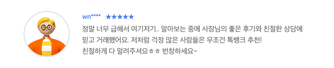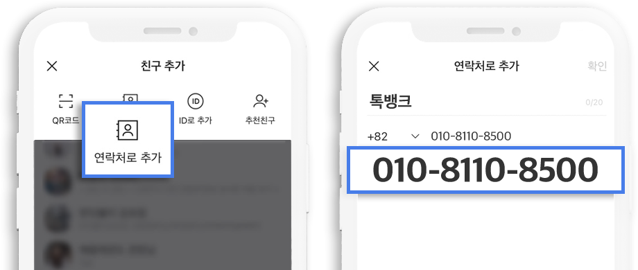 카카오톡 연락처로 추가 > 친구이름 : 톡뱅크로 설정 후 문의주시면 친절하게 상담해 드립니다.